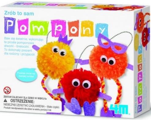 POMPONYBaw się świetnie, wykonując te proste pomponowe stworki - breloczki. To doskonały prezent dla rodziny i przyjaciółZAWARTOŚĆ:- 3x kłębki kolorowej włóczki,- kolorowy filc- 4 tekturowe krążki- 6 par poruszających się oczu- 3 breloczki- dwustronna taśma klejąca- szczegółowa instrukcja