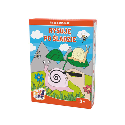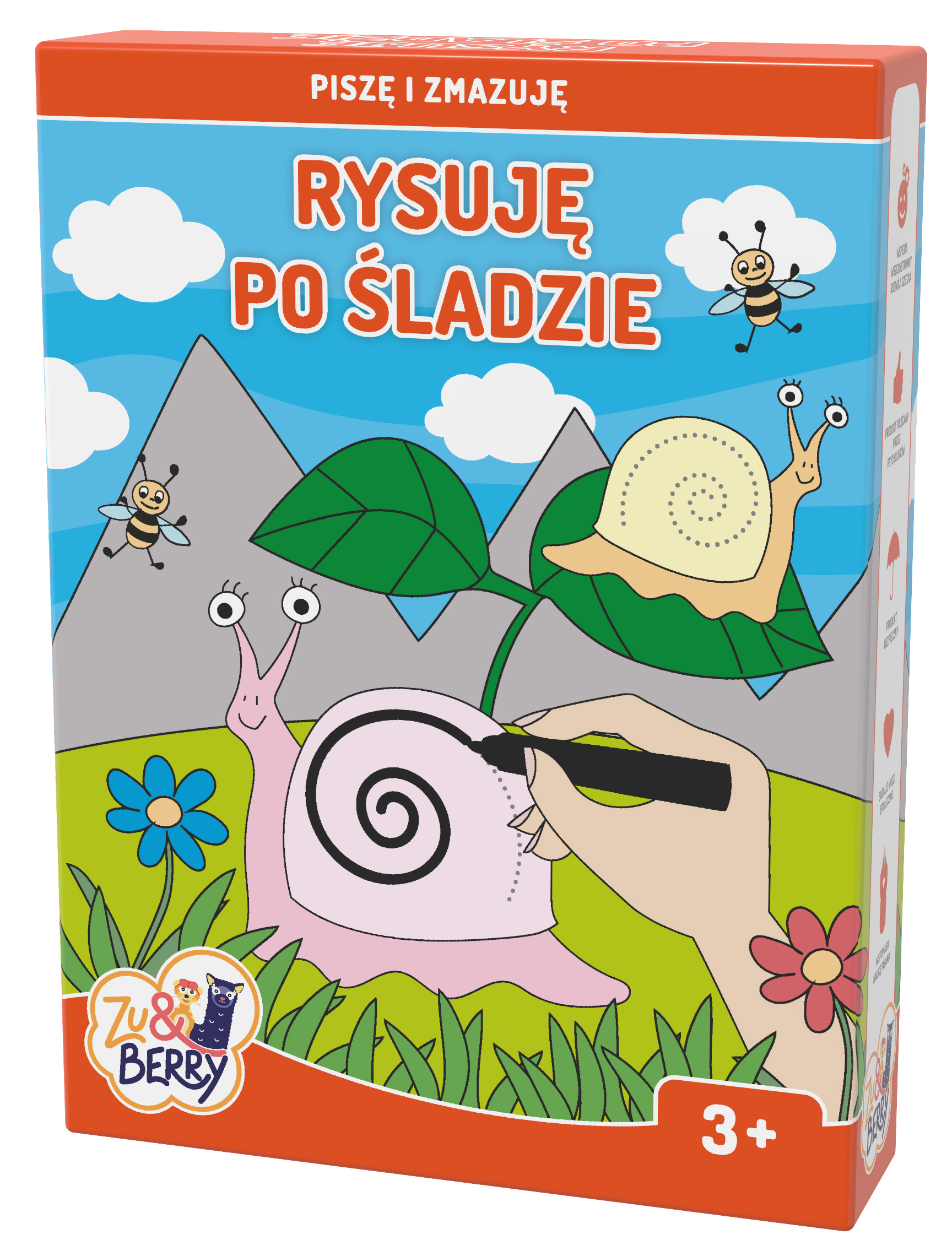 Rysuję po śladzie to zestaw kart z obrazkami o tematyce bliskiej dzieciom (zwierzęta, baśnie, pojazdy, przyroda), które wspomagają doskonalenie tych umiejętności. Na każdej planszy znajdują się kropeczki, które dziecko łączy za