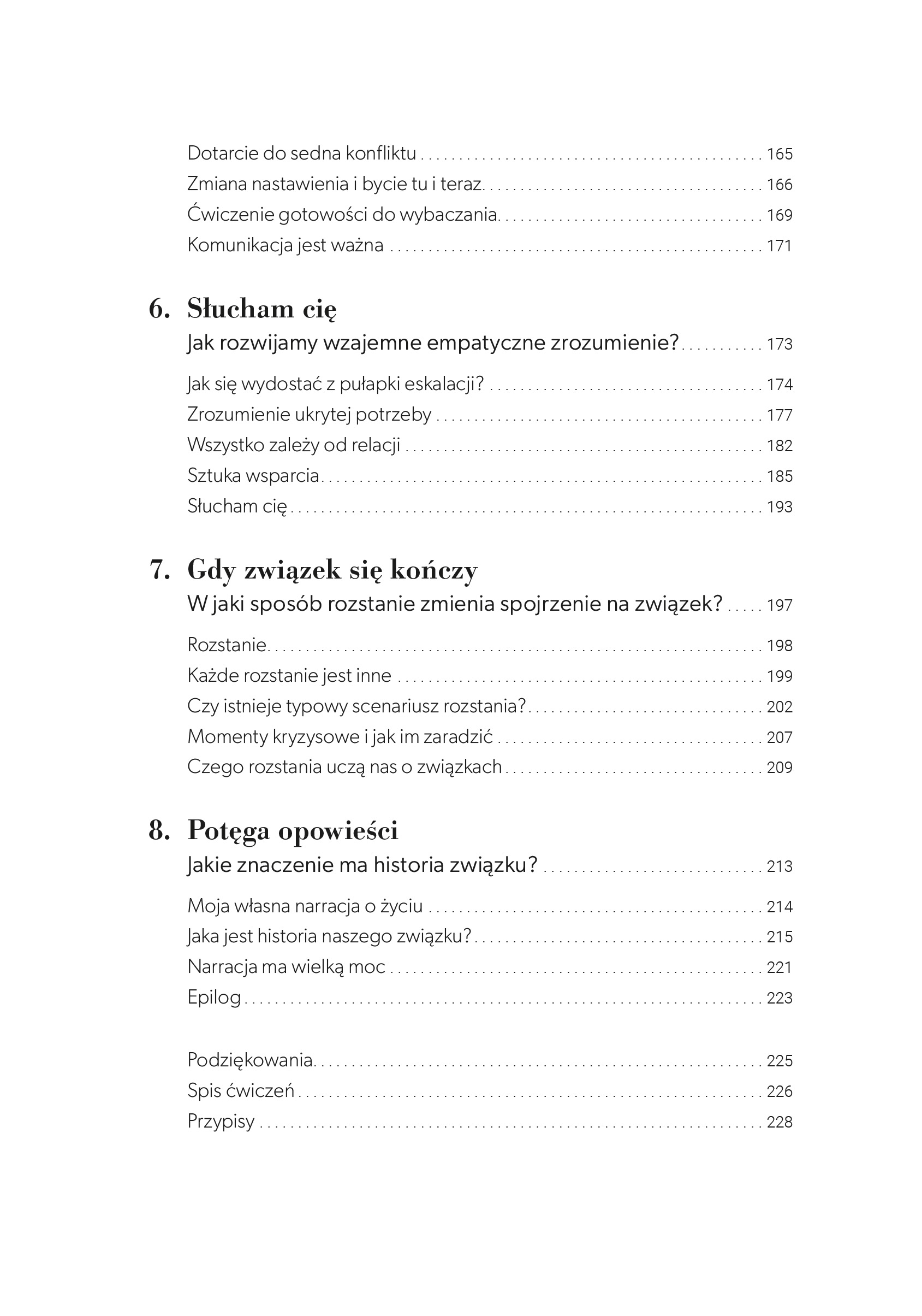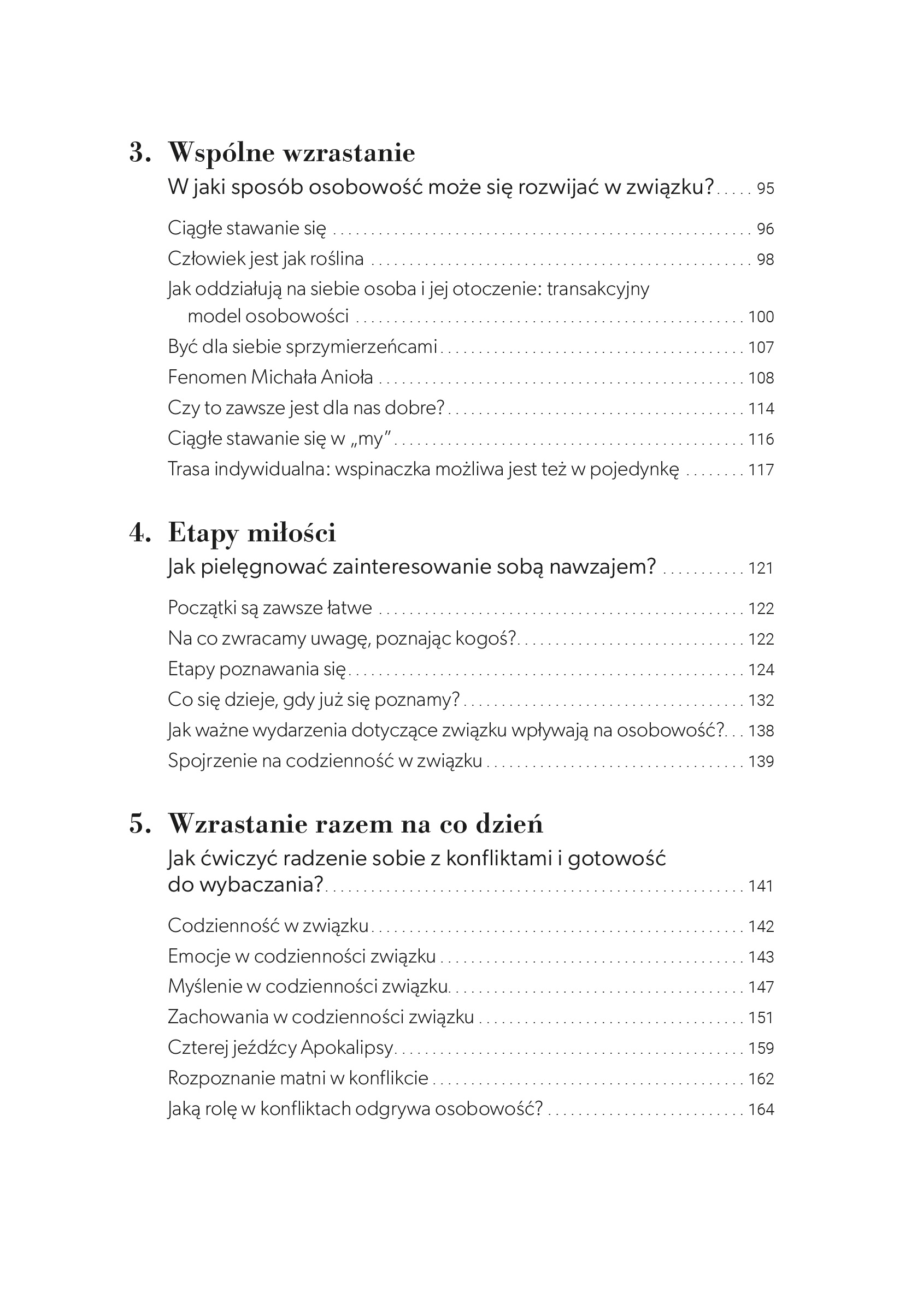 Opis produktuZasady bezpieczeństwaCo sprawia, że związek jest satysfakcjonujący dla obu stron? Co zrobić, aby nasza relacja kwitła, a przy tym pomagała nam się rozwijać, zamiast nas ograniczać? Jak osiągnąć równowagę między „ja”, „ty” i „my”? Psycholożka i naukowczyni Janina Larissa Bühler odkrywa przed czytelnikami tajemnice kształtowania się ludzkiej osobowości i jej wpływu na relacje, a także udowadnia, że zarówno podobieństwa, jak i różnice między partnerami są fundamentami trwałych i szczęśliwych związków. Z książki dowiesz się, jak: • lepiej poznać samego siebie poprzez związek, • traktować zmiany jako okazje, a nie zagrożenie dla relacji, • stale się rozwijać, razem i osobno, • osiągnąć głębokie wzajemne zrozumienie, • unikać eskalacji konfliktów i wyciągać z nich konstruktywne wnioski, • przeciwdziałać nudzie i monotonii, • wspólnie pogłębiać empatię i zdolność do wybaczania, • wiedzieć, jak i kiedy się rozstać. Opierając się na wynikach najnowszych badań, autorka oferuje mnóstwo przystępnie podanej wiedzy, praktyczne ćwiczenia do wykonania samemu lub z partnerem i pytania skłaniające do refleksji, które pomogą ci rozbudzić radość z poznawania najbliższej osoby i zadbać o waszą relację jak nigdy wcześniej. „Ludzie chcą się rozwijać w każdym wieku. Bez względu na to, od jak dawna są parą, zawsze mogą się wspierać w stawaniu się takimi, jakimi chcą być. To wzajemne wsparcie sprawia, że gdy się rozwijamy, możemy kochać intensywniej. Kiedy bowiem wzrastamy, jesteśmy szczęśliwsi. A kiedy jesteśmy szczęśliwsi, kochamy piękniej, swobodniej i radośniej”. „Związki partnerskie stwarzają idealne warunki do rozwoju osobistego. Dzieje się tak dlatego, że w bodaj żadnym innym kontekście nie poznajemy drugiej osoby tak bezpośrednio i osobiście, jak w intymnej relacji. Możemy dostrzec w partnerze odbicie wzorców zachowań, których nie lubimy w nas samych, lub odkryć nieznane nam dotychczas strony własnej osobowości. Konfrontujemy się z kimś, kto ma własne preferencje i system wartości, dzięki czemu otwierają się przed nami nowe światy”.