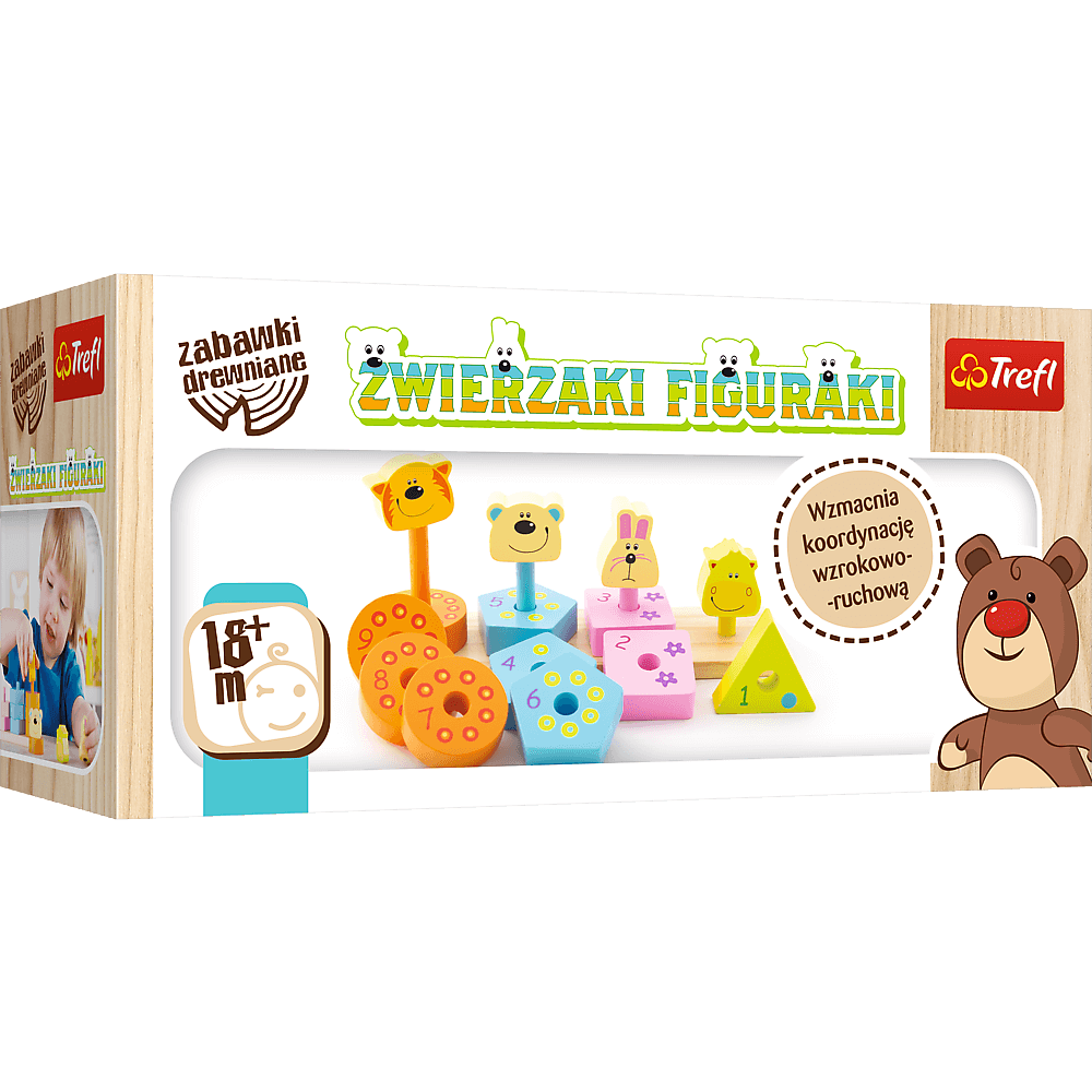 Uśmiechnięte zwierzaki wykonane z jasnego, naturalnego drewna są doskonałą zabawką ogólnorozwojową Znakomite rozwiązanie dla dzieci od 18 miesiąca życia Rozwijają umiejętność logicznego myślenia i koncentracji od najmłodszych lat Zwierzaki Figuraki to wielobarwne krążki z cyferkami w różnych ilościach i kształtach, służące do nauki kształtów, kolorów i liczenia Zabawka wspomaga naukę rozpoznawania kształtów i kolorów, wzmacnia koordynację wzrokowo-ruchową, rozwija umiejętność logicznego myślenia i koncentracji, wspomagając jednocześnie zręczność i umiejętności manualne Wszystkie materiały wykorzystane do stworzenia zabawki posiadają atesty, a także zostały pomalowane nietoksycznymi farbami x