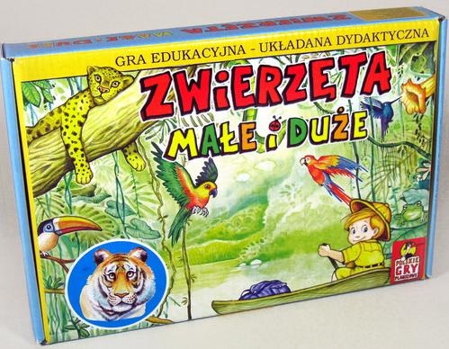 Gra, układanka dydaktyczna dla dzieci. Zawiera 48 kartoników, na których znajdują się litery alfabetu, ilustracje i nazwy zwierząt.
